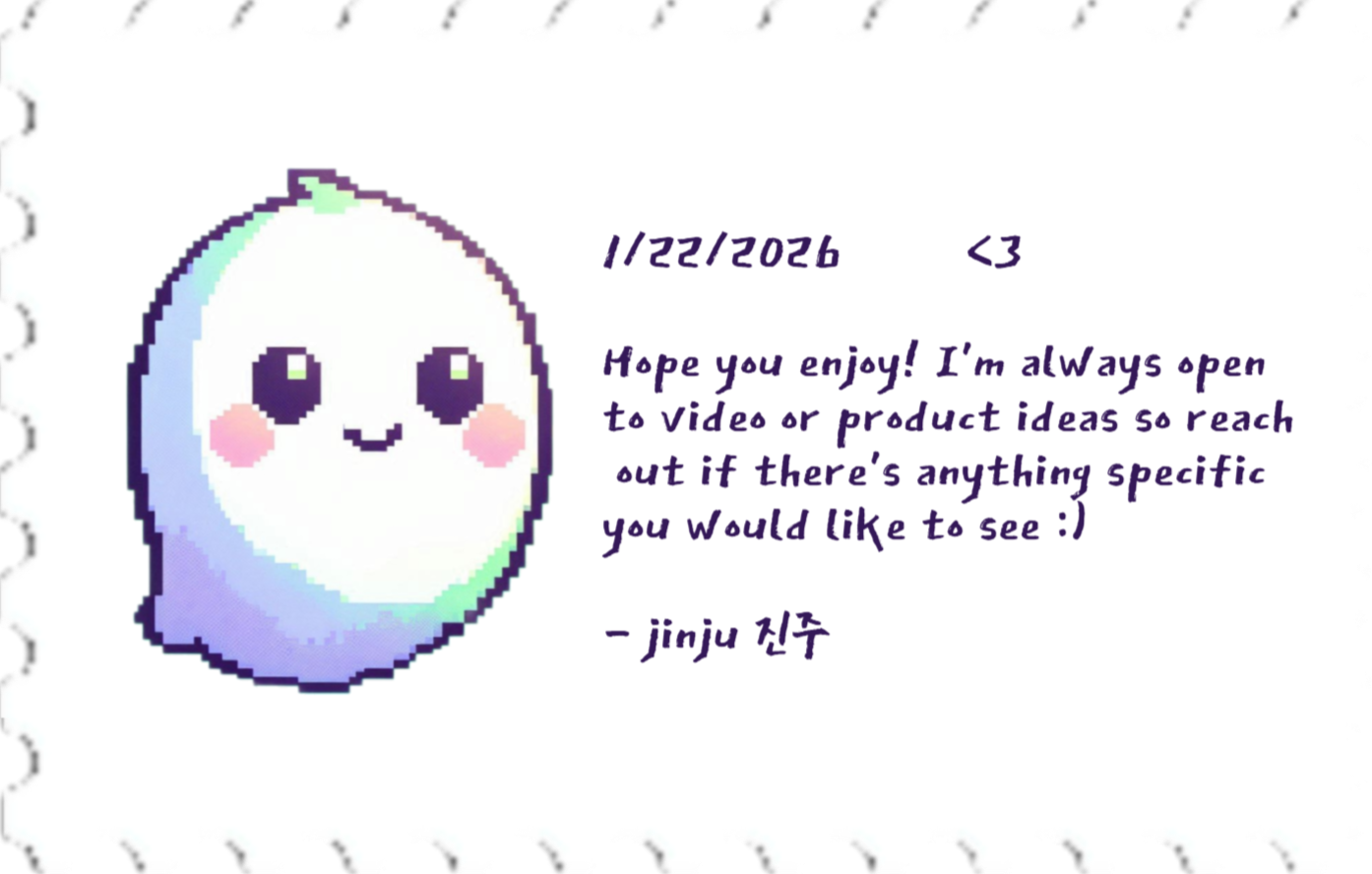 Hello! I'm Jinju. This is where you’ll find links to everything I create (videos, art, products, and more) inspired by the things I love like art, baking, travel, gaming, growing in my faith and more. I believe in living simply and doing what I love.